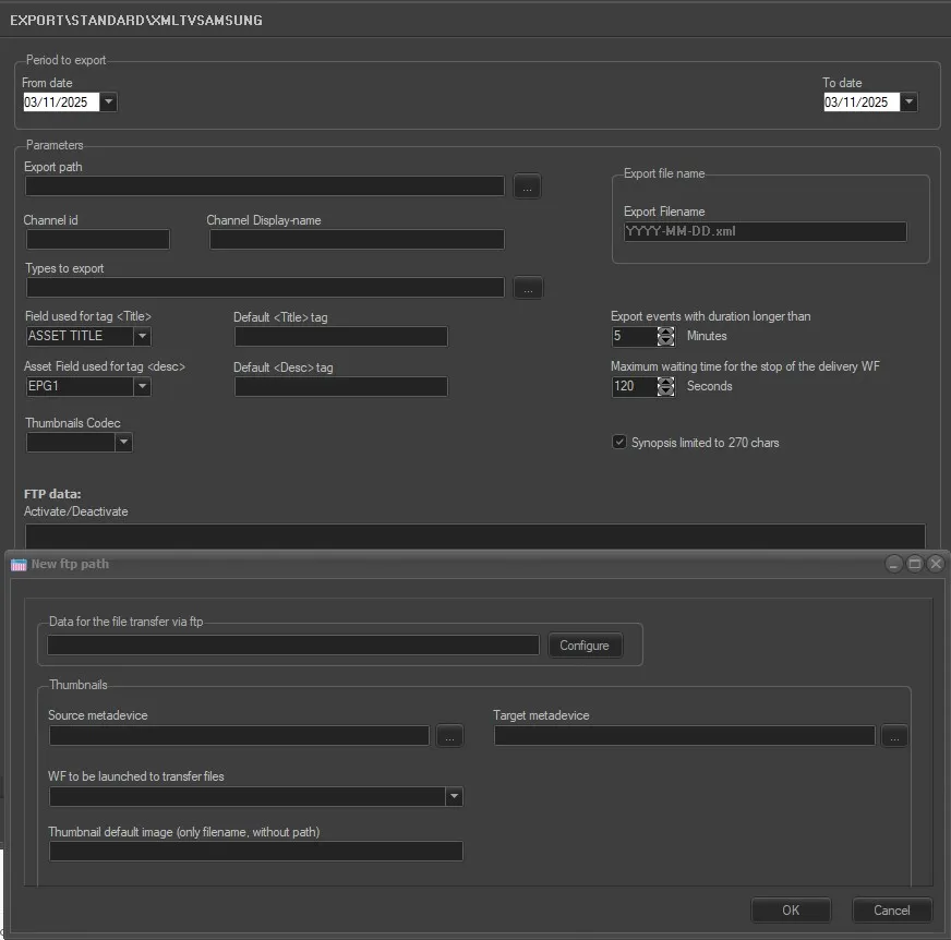 • Field used for tag <Title>: It's possible to choose the database field where the content of the tag <title> should be taken from. Available fields are: ASSET TITLE, STORY, EPG1, EPG2.