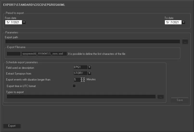 The CISCO ROSA export creates an .XML file containing the on-air schedule of one or more days. As it names indicates, this export has been developed to provide the Cisco Rosa Service Information with an 'understandable' file from which retrieve EPG information such as event schedule descriptions, and other event-related topics in a television network.