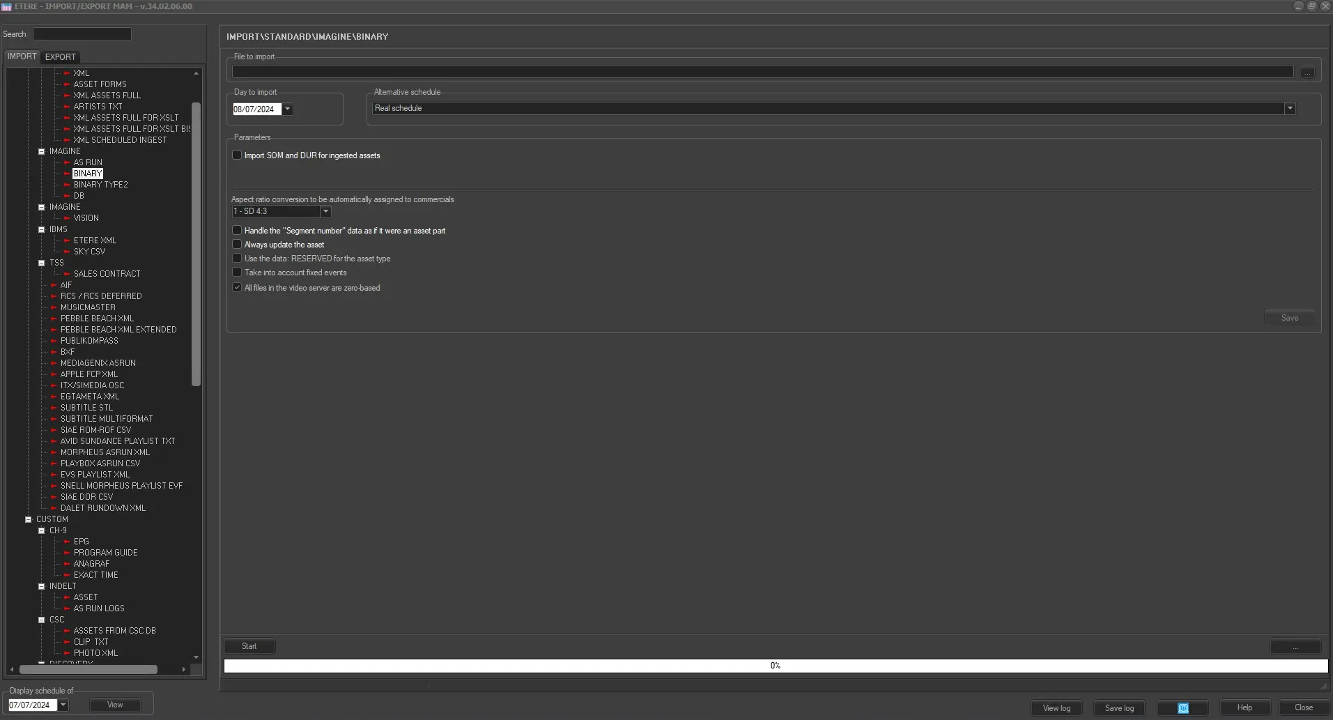 The Imagine Binary Import allows to import a Binary file (.LST, .LOG, etc.) containing the schedule of a certain date.
