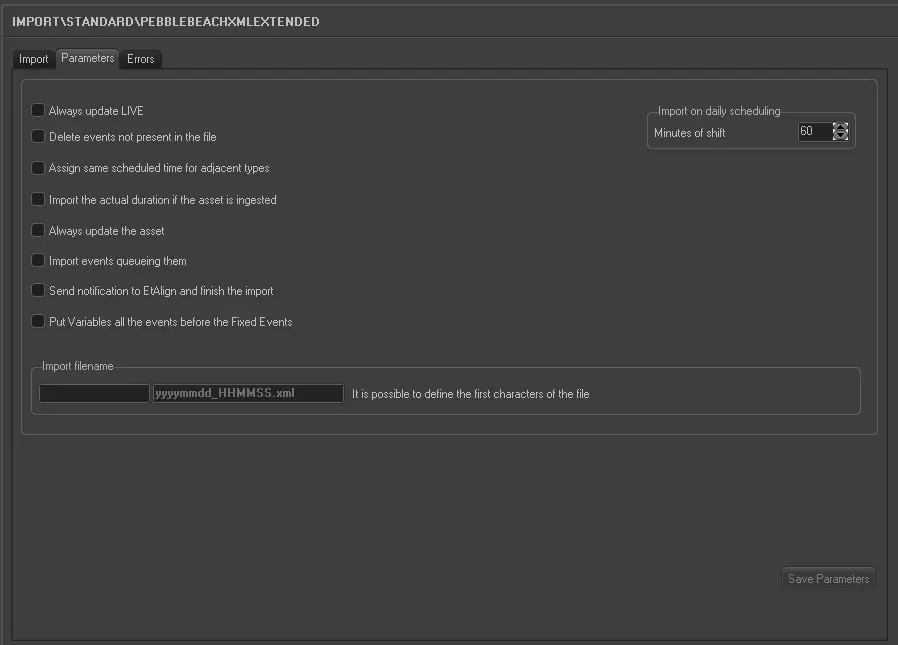 The Pebble Beach Extended import allows importing the programming playlist of a certain television day from an XML file. Among the tags managed for each imported event, the following can be mentioned: