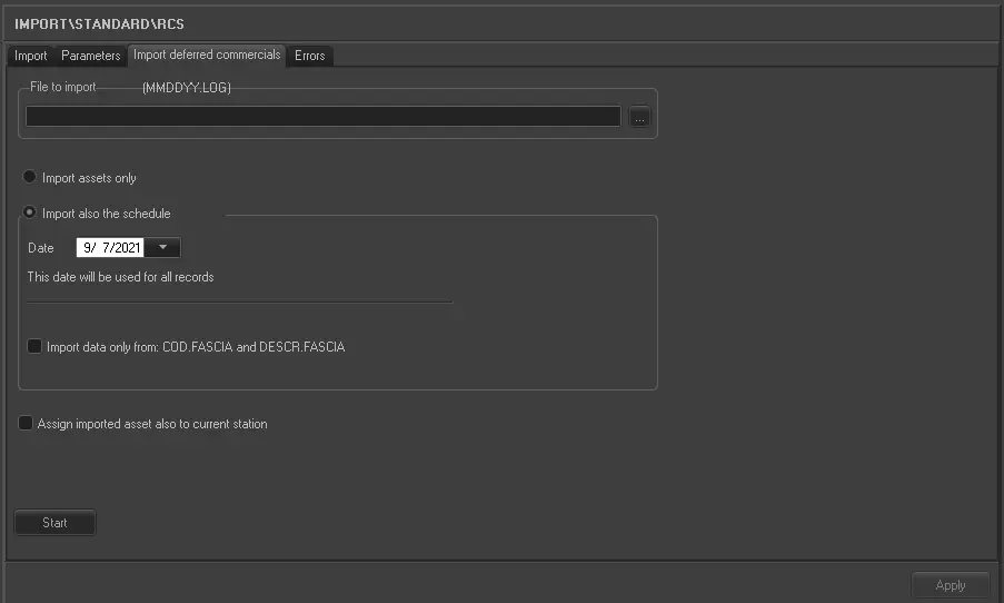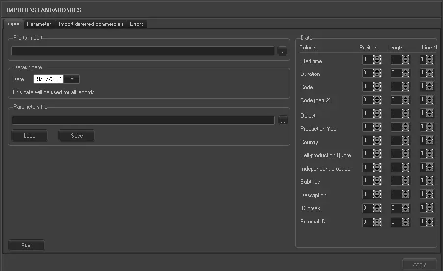 The RCS import allows to import a broadcast schedule exported from a DVB-RCS system into a plain-text (.txt) file.
