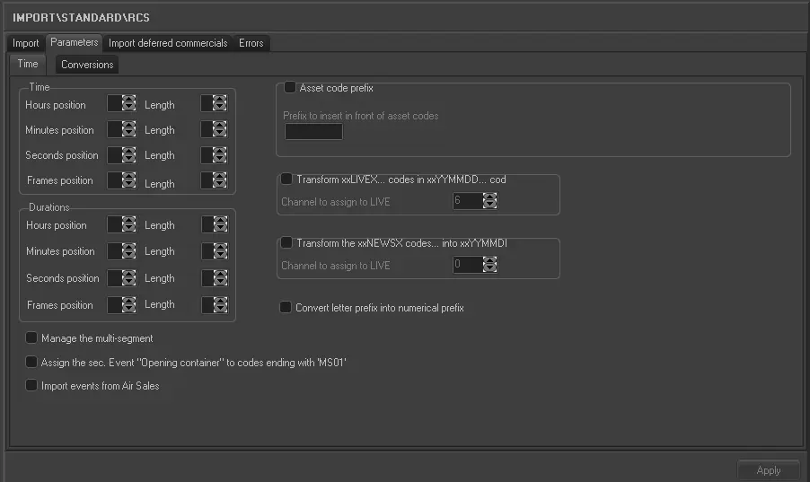 Description : If enabled, all imported asset codes containing the "NEWSX" string (from the third character onwards) will be renamed replacing that string in YYMMDD (year, month and day) of the imported schedule.