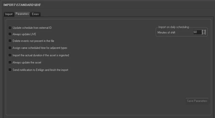 •Import on daily scheduling: If you are importing the schedule for the current day, this parameter indicates what time on the schedule the import starts from (calculated as [current time] + [time shift]). Events with a start time before the current time will not be imported.