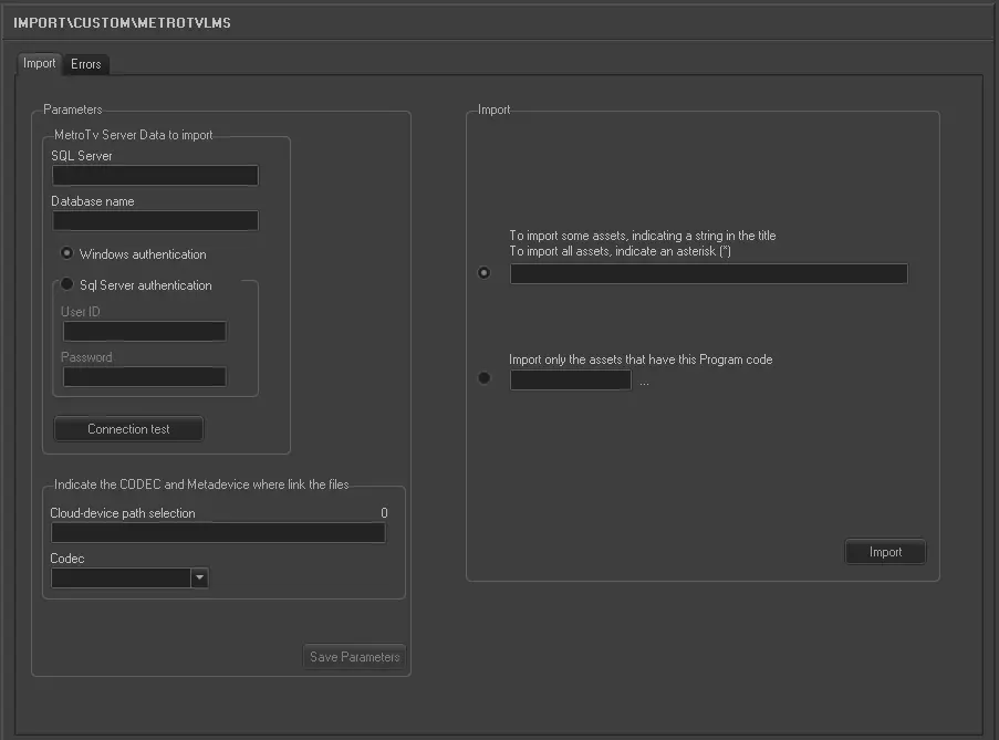 The import custom METROTVLMS import an XML file containing LMS field data such as title, call/contact number, shooting location, shooting date, clip category, program name, script and LTO code into Etere database. The import would update the metadata if asset exist in database, else the import would create new assets in database.