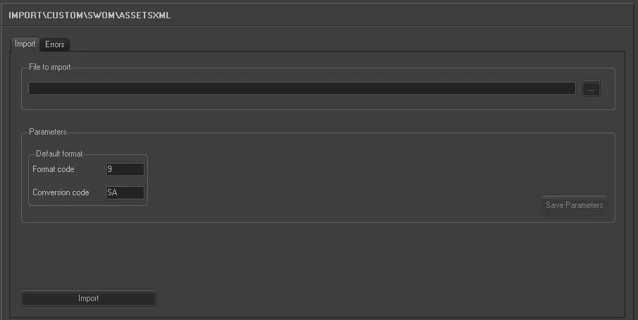 The "SWOM - Assets XML" import is able to import an XML file named as "code.xml" (e.g. EHD~t875140I.XML) which contains data related to a certain asset.