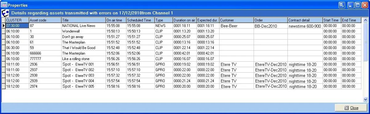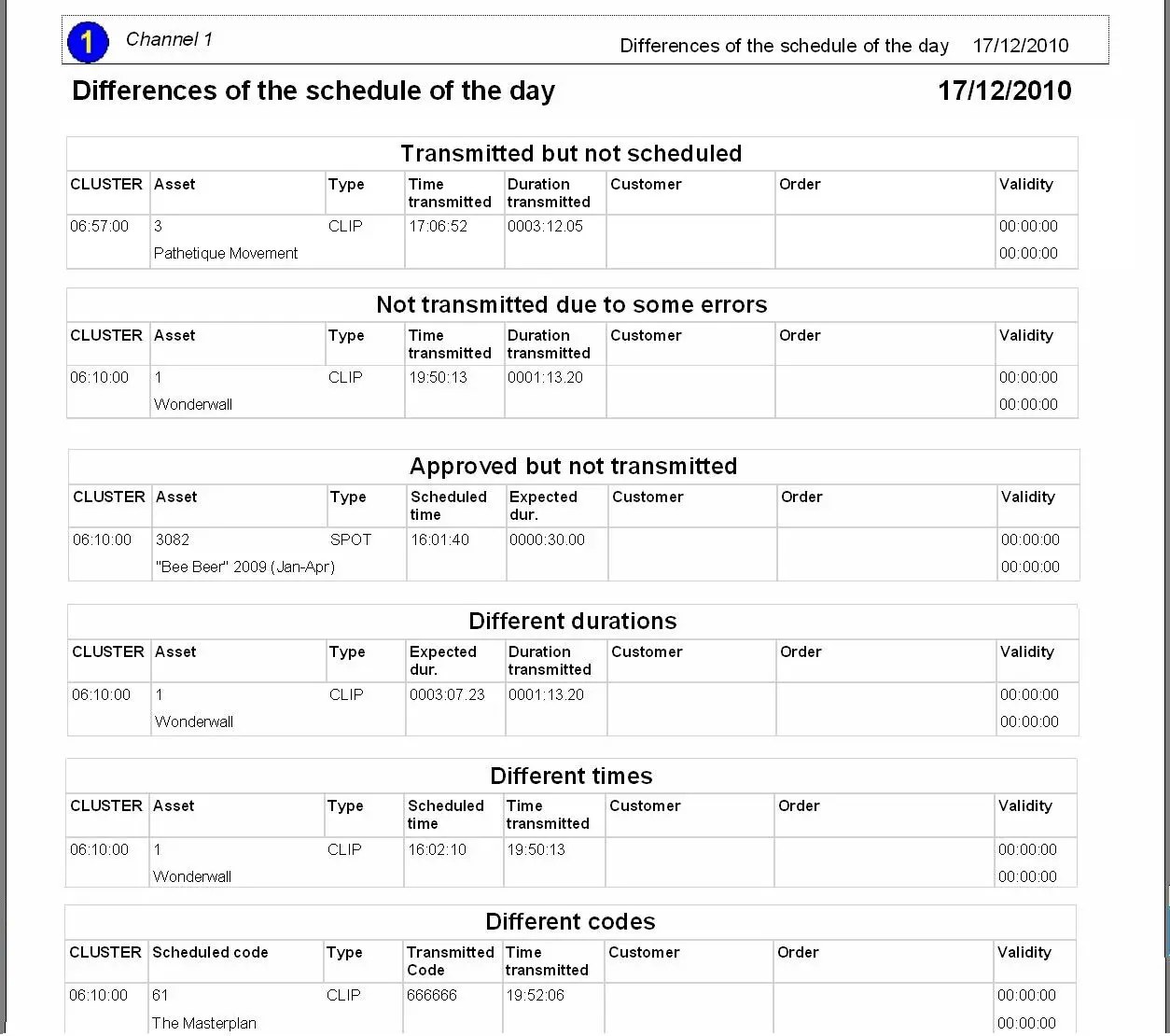 •To transmit but not transmitted: Events present in the on-air schedule either in a different cluster respecting to the approved schedule or in the same cluster but in a different position (e.g.: a shifted commercial break).