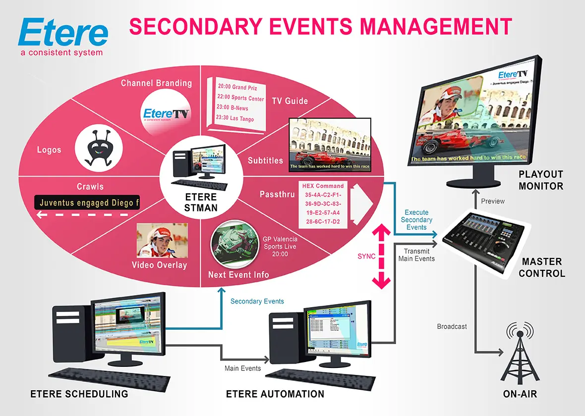 The STMan module will be connected to the central distributed Etere system to execute specific actions each time it detects that a scheduled event has secondary objects linked to it. The diagram below clearly illustrates how Etere uses STMan to manage secondary events associated with scheduled events during a synchronized playout: