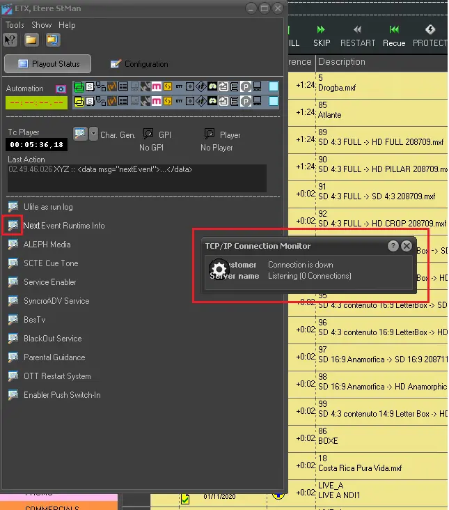 Once this feature is enabled, Etere STMan will start sending configured Next Event Information. A [Next Event Runtime] will appear on the Playout Status window, by clicking on it will be possible to view the current connection status (i.e.: down or ok) as well as the number of connections: