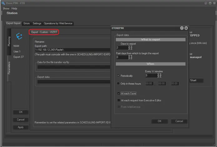 In order to keep Etere and Vizrt system aligned and synced to each other, Etere playlist must be exported in an XML format into a shared location, from where Vizrt system will import it to have all events and metadata updated.