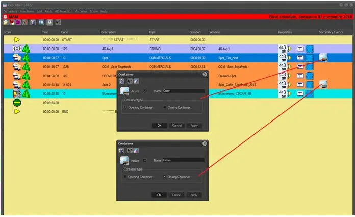 The use of Container secondary events within a schedule will permit to insert graphic titles into a whole block of events (differently configured across their STMan tabs); this operation can be performed by following the next procedure: