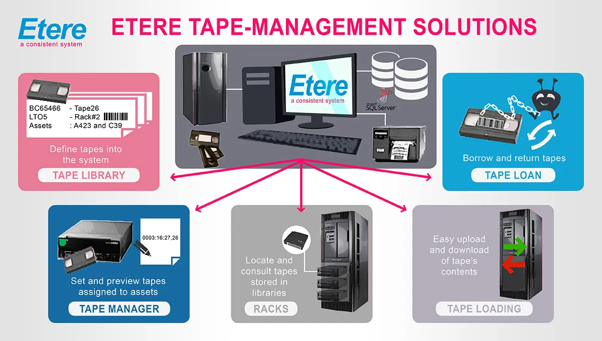 Etere Tape Management is a set of solutions for allowing stations to carry out the management of tapes (i.e., videotapes, data tapes, cartridges, discs) by providing them with a set of modules specifically designed to improve the most important tasks involved in the management of tapes, just as shown in the figure below: