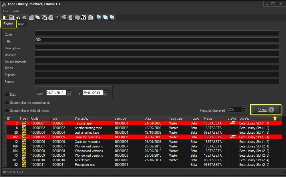 Once the search filters have been compiled, just press the [Search] button, all tapes matching said filters will be listed in the results area (currently loaned tapes will be highlighted in red).