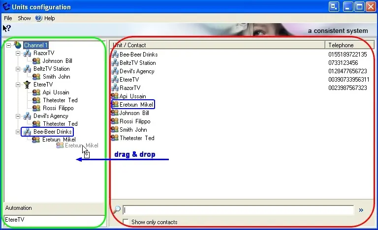The Units Configuration section allows to create relationships between companies and contacts, thus permitting to specify during a loan the company and the exact person to which the tape has been delivered. To add companies just drag and drop them from the right panel to the left one, and to link contacts to companies just drag them inside already-added companies: