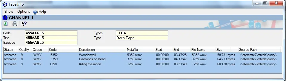 The Tape Info tool provides a detailed list of all media contained on a certain Tape/Cartridge (or VTR/Drive). For each stored metafile here will be displayed the most relevant information regarding the stored asset (e.g. status, quality, codec, codec, description, etc):