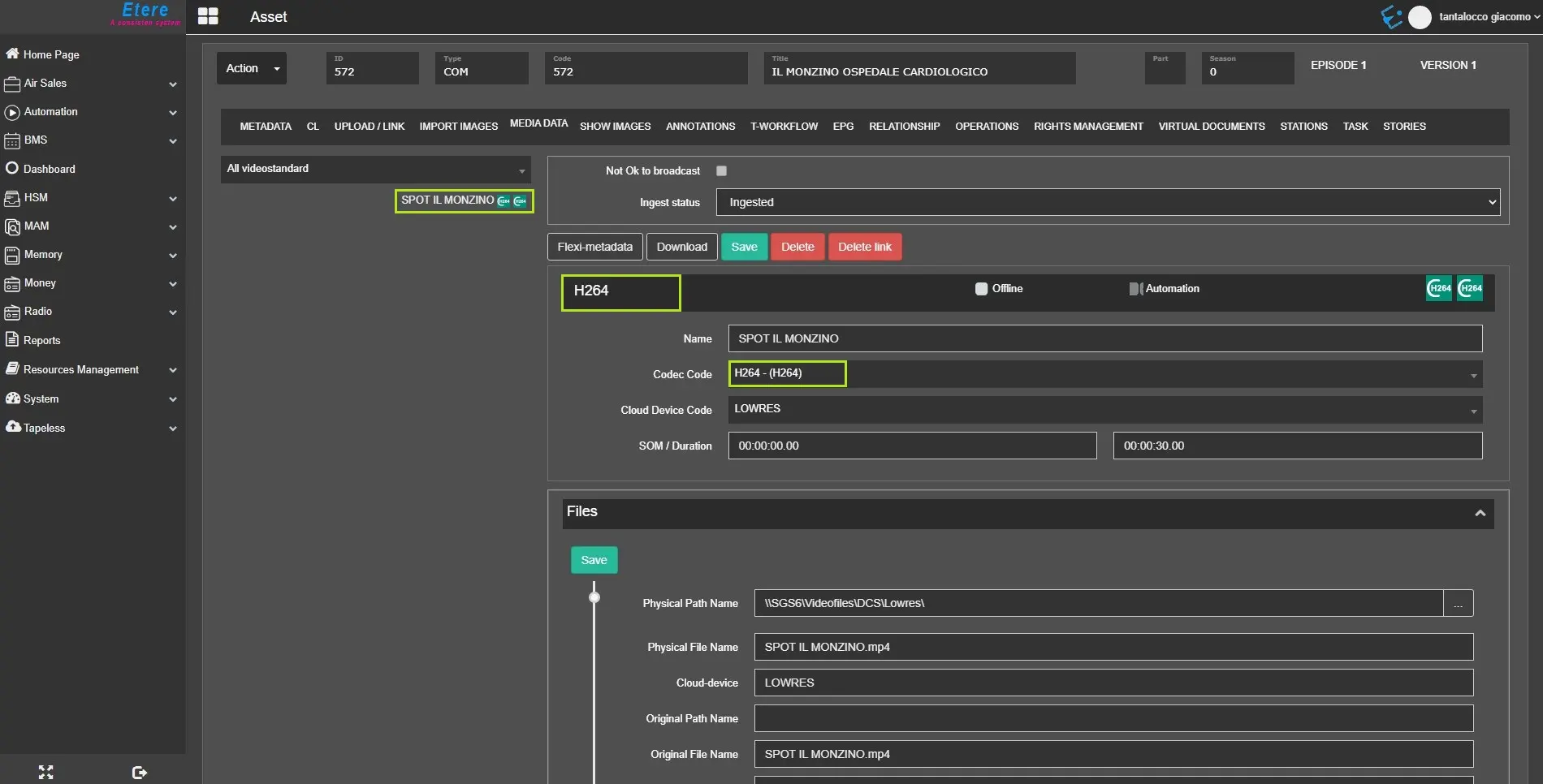 The Media Data TAB contains information regarding the asset's associated media file, file name and location, the SOM duration and the codec used.