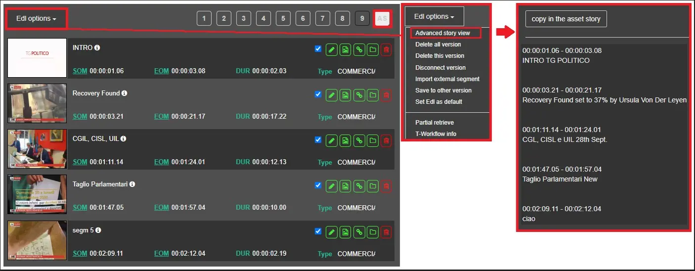 Once the segments have been created and saved in the AS level, you can use the Advanced Story View button to see all the segments in a single window. In this window, as well as seeing them, we can also use the "Copy in the asset story" button to copy all the data entered in the EPG->STORY field.
