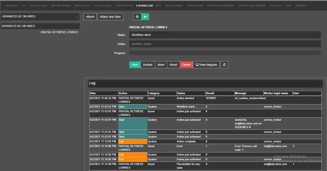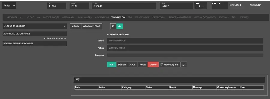 The T-Workflow TAB enables management of the current Etere T-workflow attached to the asset. You can click on any T-workflow listed on the left panel and view the T-workflow information, e.g. workflow status, actions in T-workflow, etc, on the right panel.