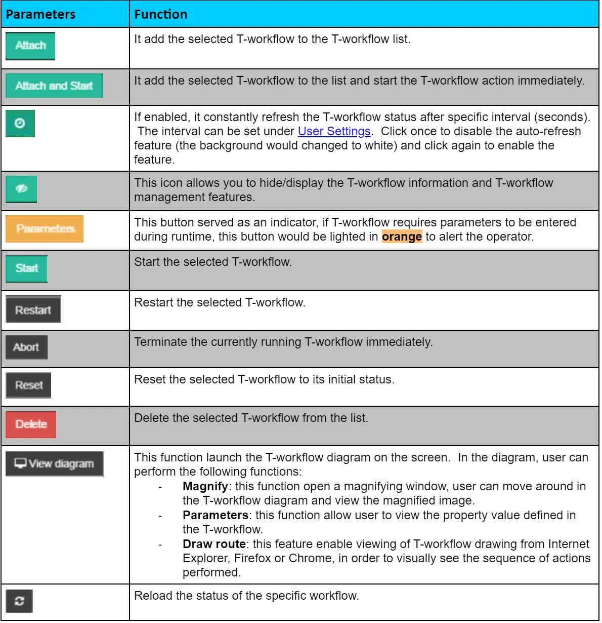 - View diagram: This function launch the T-workflow diagram on the screen. In the diagram, the user can perform the following functions: