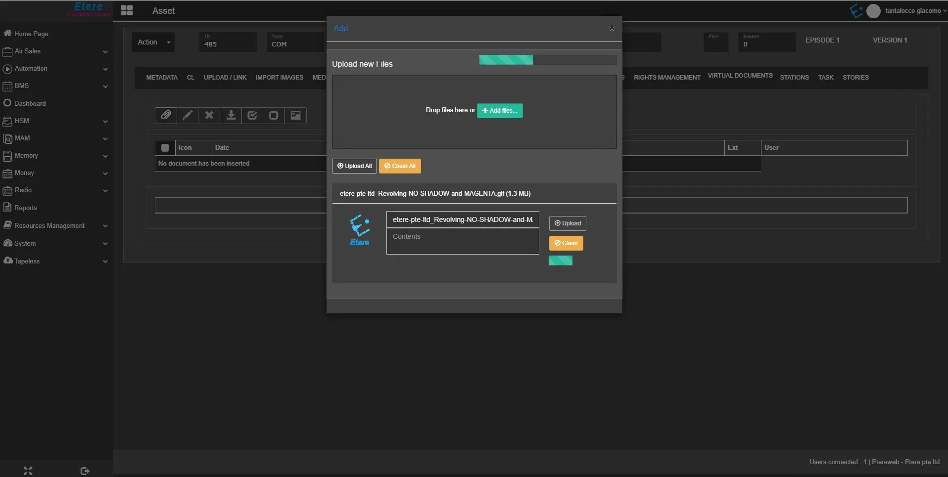 The Virtual Documents tab displayed all the digital files (e.g. image, document, PDF, text, etc.) attached to the current asset using the Etere Document Management (DoMa) feature.