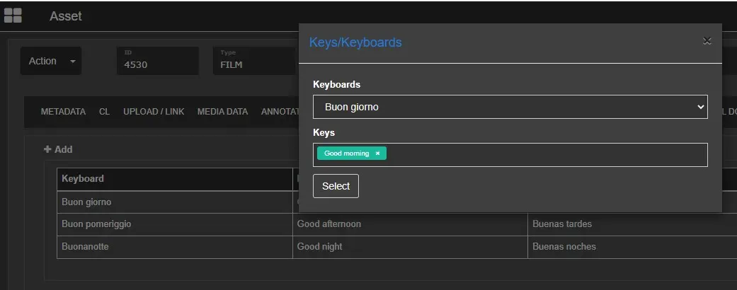 As per the client version, the "Keys/Keyboards" section allows operators to easily enrich assets by selecting their related metadata through the keyboards (and keys) available on the system. To associate metadata to an asset, just click on the desired category (keyboard) and the related items (keys):