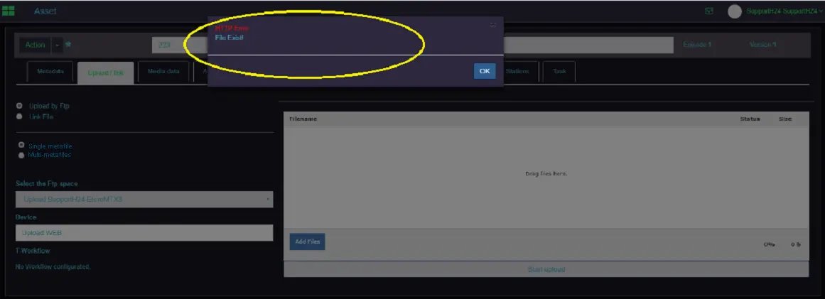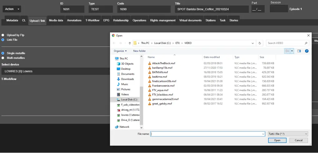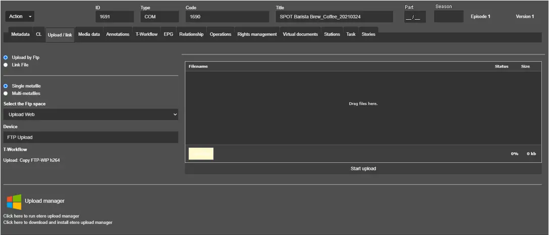 When a user accesses EtereWeb with a compatible browser, the user is allowed to upload a media file to the Web server via an FTP Server or link file from a specific path.
