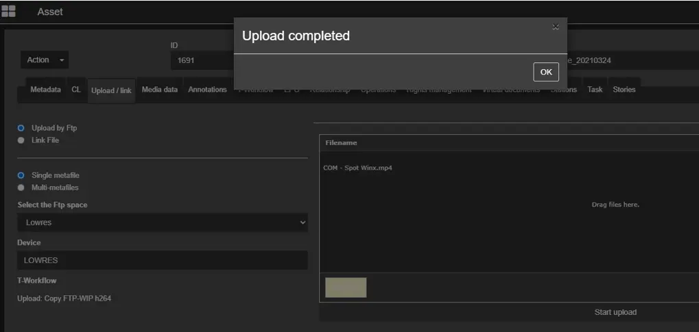 WARNING:The "Upload / Link" functions coexist in EtereWeb. Unlike desktop applications, where different workflows are configured for dedicated tasks, both features use the same default workflow to trigger the request.