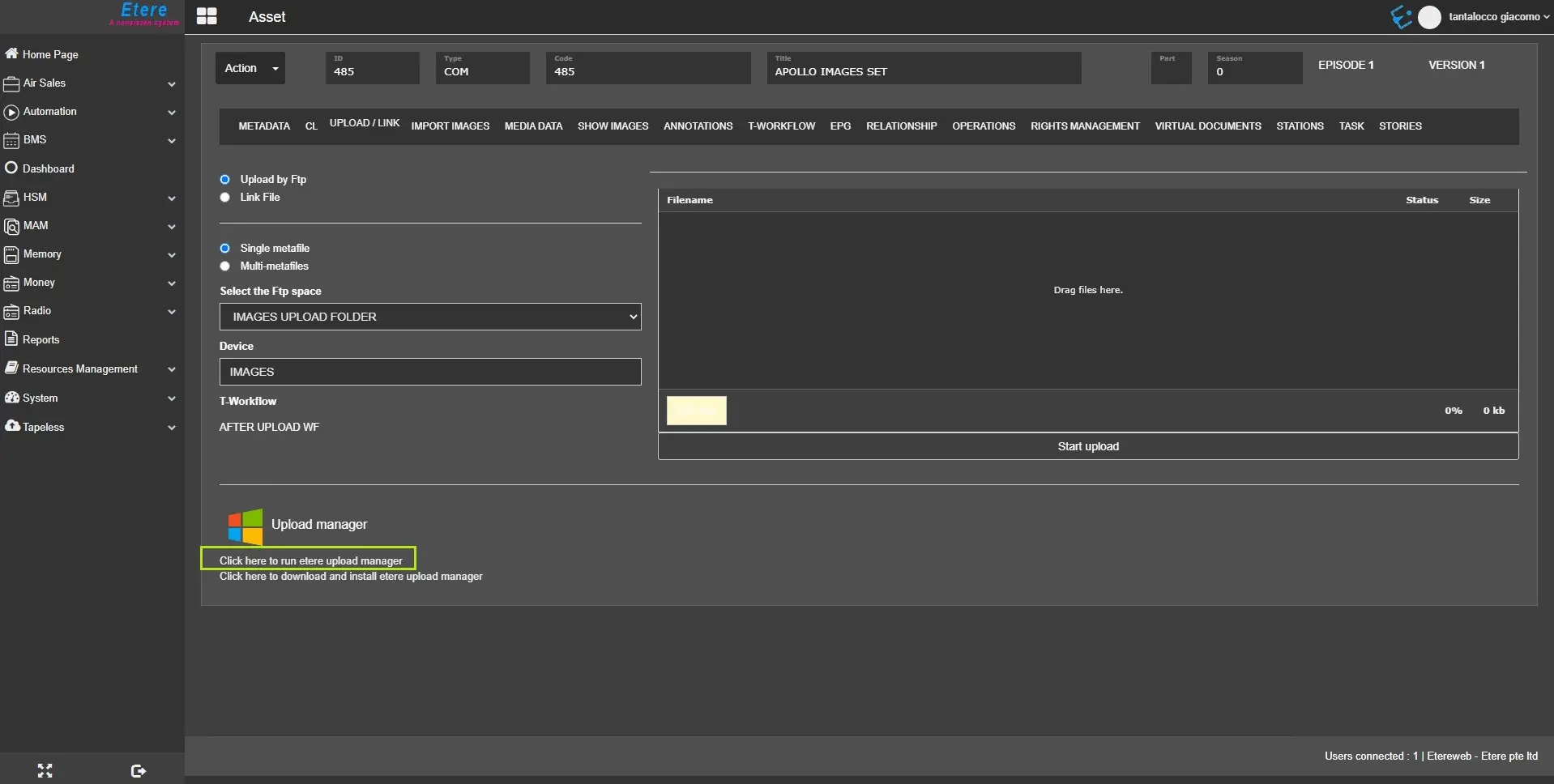 Once the Upload Manager is installed, click “Click here to run Etere Upload Manager” to launch the uploading dialogue for the selected asset.