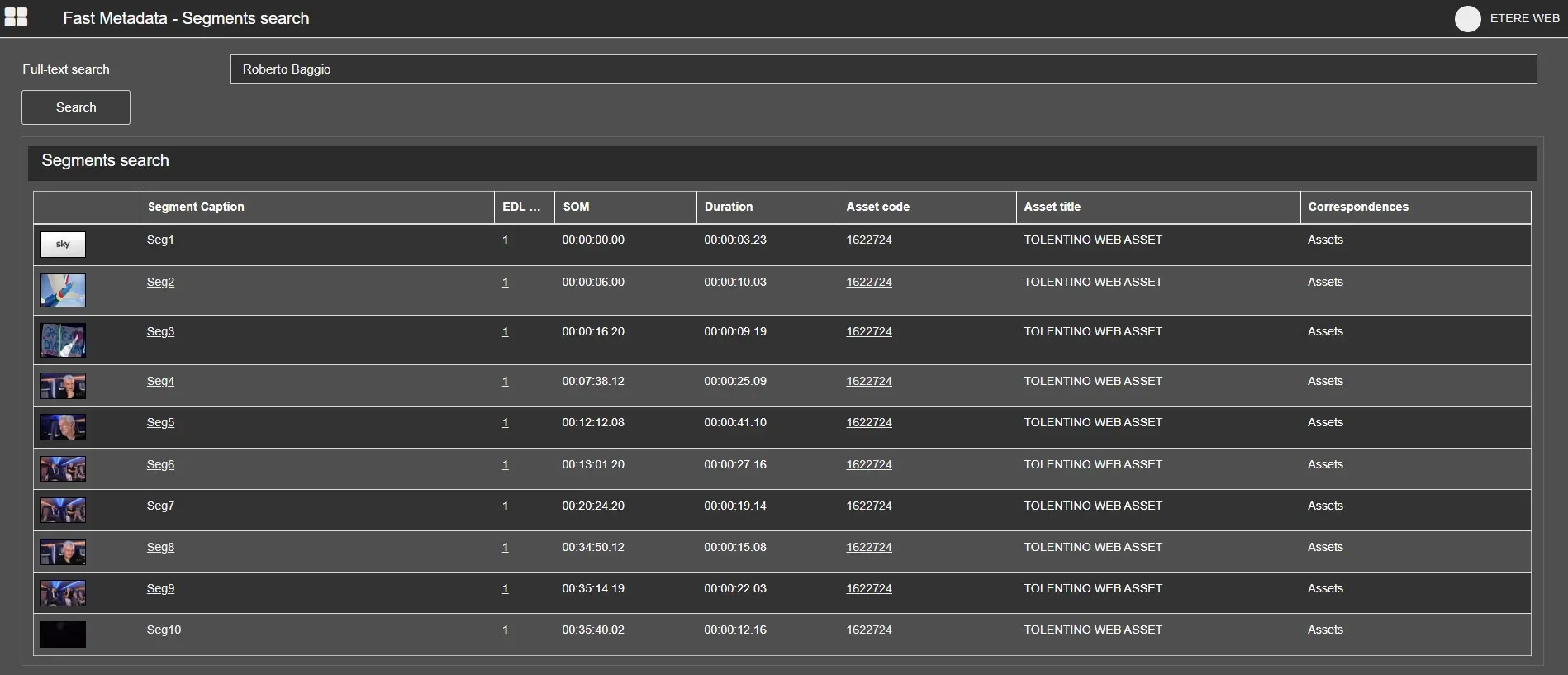 Segments Search is performed full-text on assets, segments, flexi-metadata, people and keywords.