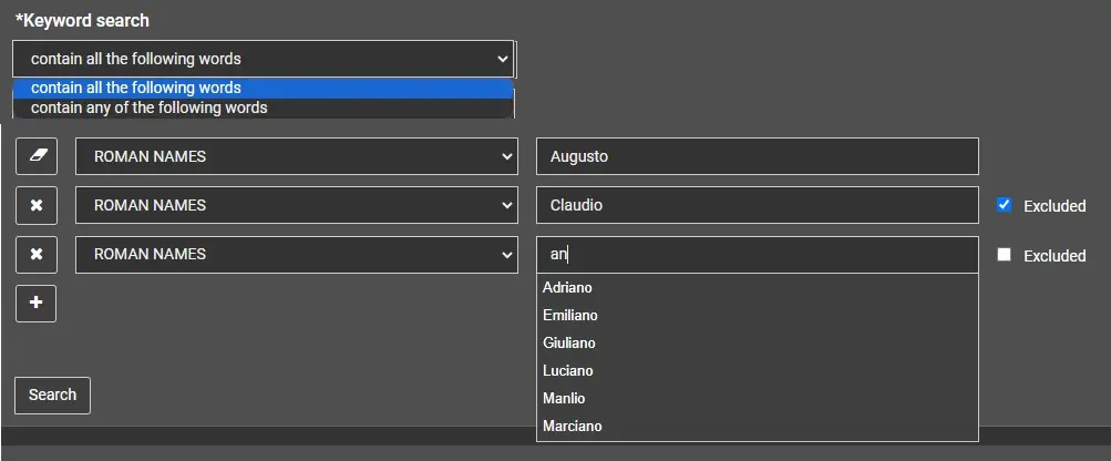 - search for items having all specified keywords or one of them (the user can select "contain all the following words" or "contain any of the followng words")