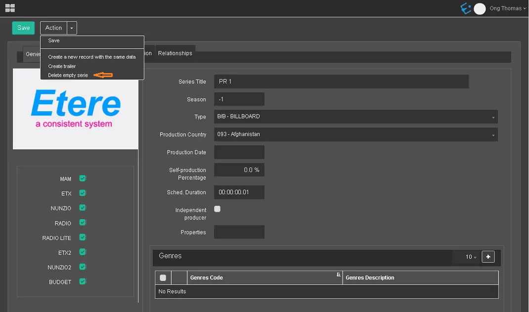 Select the Delete empty Season function within the Action Menu to delete the Season.