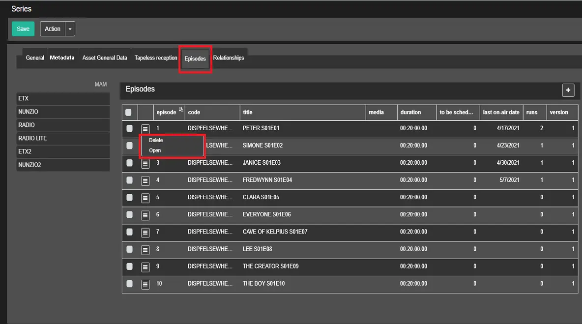 If you wish to modify the episode, left-click on the episode area name and select the available action, as indicated in the above image.
