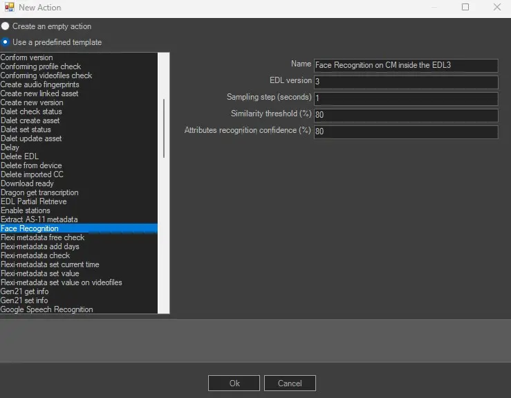 Then, in the left part of the "new action" window we have to select "Use a predefined template" then we have to scroll down through the list of actions and select Face Recognition by clicking over it.