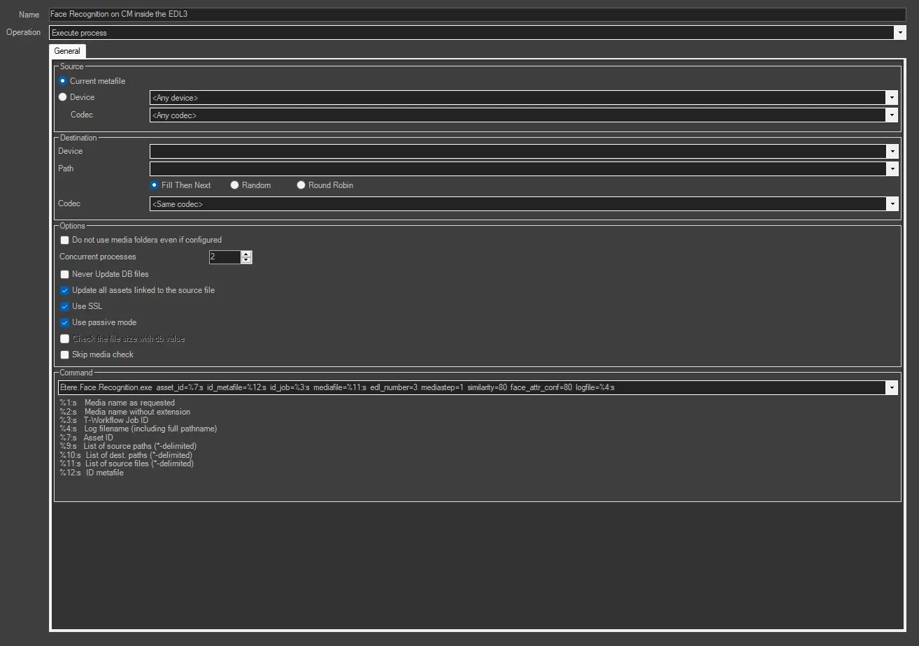 Etere.Face.Recognition.exe asset_id=%7:s id_metafile=%12:s id_job=%3:s mediafile=%11:s edl_number=8 mediastep=3 similarity=85 face_attr_conf=85 thumbnails=no logfile=%4:s