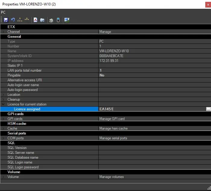To apply the licence to a workstation we have to open Etere Configuration > Resources Editor > select the correct Workstation by double left click of the mouse over it > go inside the section "Licence for current station" > inside "Licence assigned" digit EA1451 > click on save button to apply the licence to the selected workstation.
