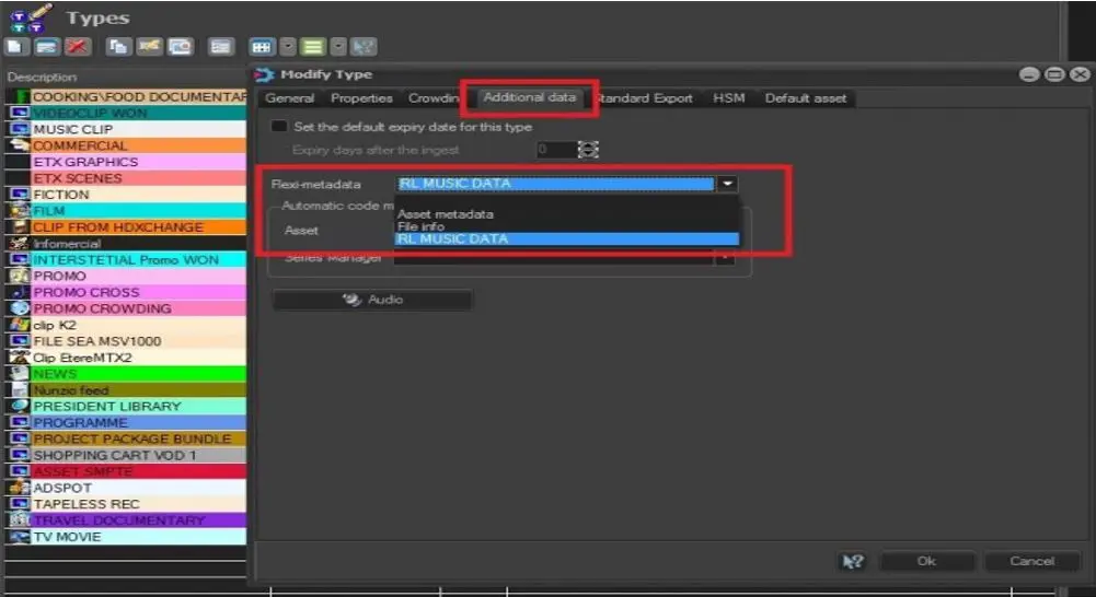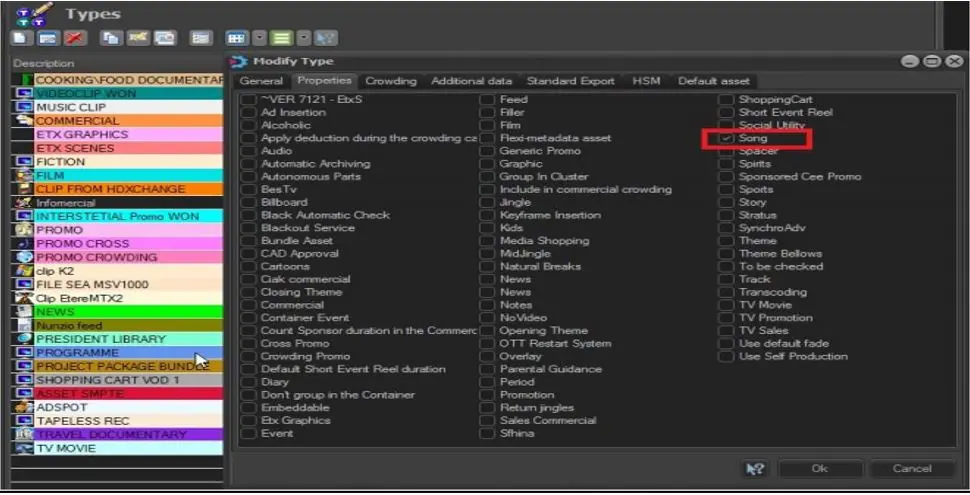 In Etere Configuration > Types, an asset type “Song” property must be created to be associated with the musical assets in the schedule.