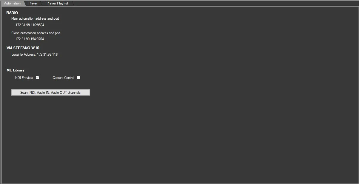 In the Automation tab, the user can see the host IP address of the server where Radio Live is installed, the IP address and port of the main playout.