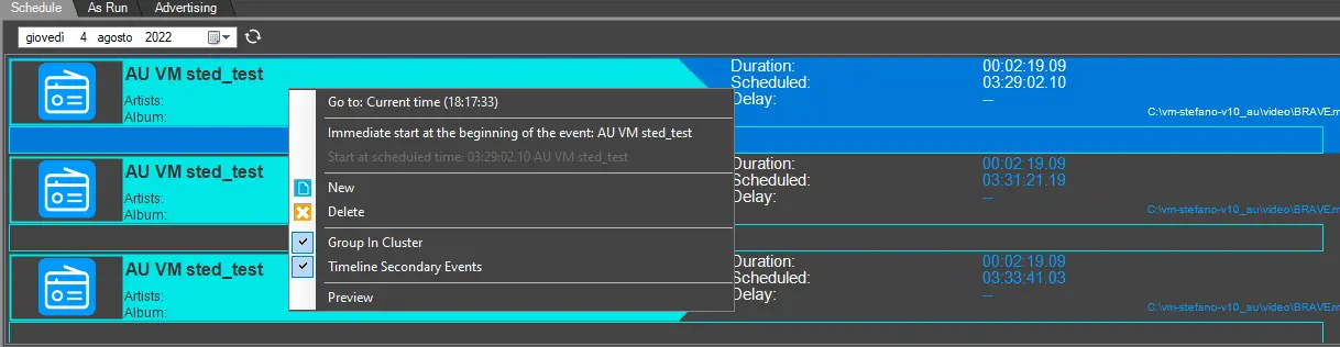 Immediate start at the beginning of the event - Starts immediately the playout of the selected event.