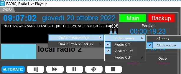 The player can be set to capture the preview from an SDI or NDI source available in the network as well as from the output of the radio playout itself. Here below are described the options available in the player's contextual menu.