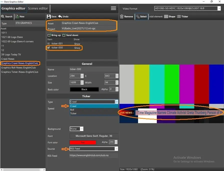 •In Ticker section, select “Crawl” to view the crawling ticker in graphics asset.