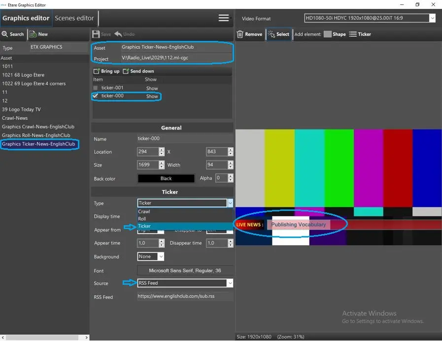 •In Ticker section, select “Ticker” to view the still ticker in graphics asset.