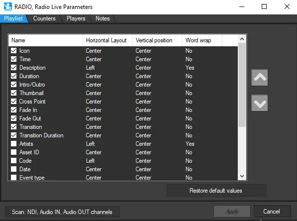 • Gpi ONAIR trigger, Play and Stop: The virtual GPIOs to exchange ONAIR commands with the mixer. For example, if the schedule is not playing, pressing the ON button on the mixer, Radio Live Director will receive the command START through the GPI specified in Gpi ONAIR Play parameter and will start the first element of the playlist.