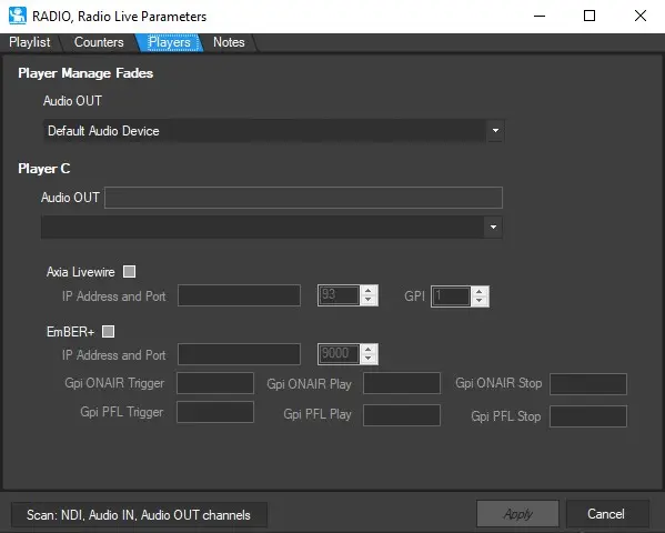 Player manage fades - Audio OUT: Choose the device for the audio output.