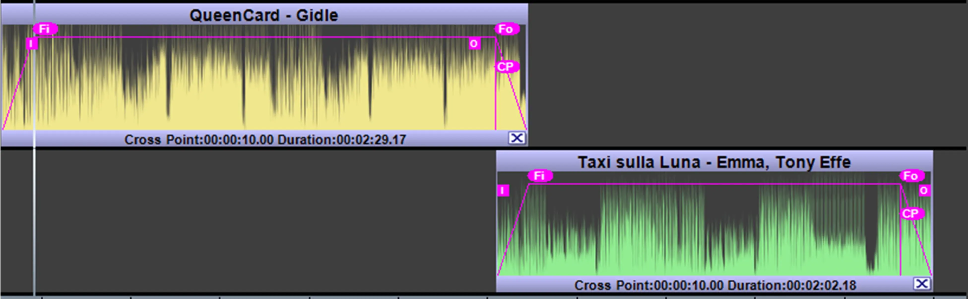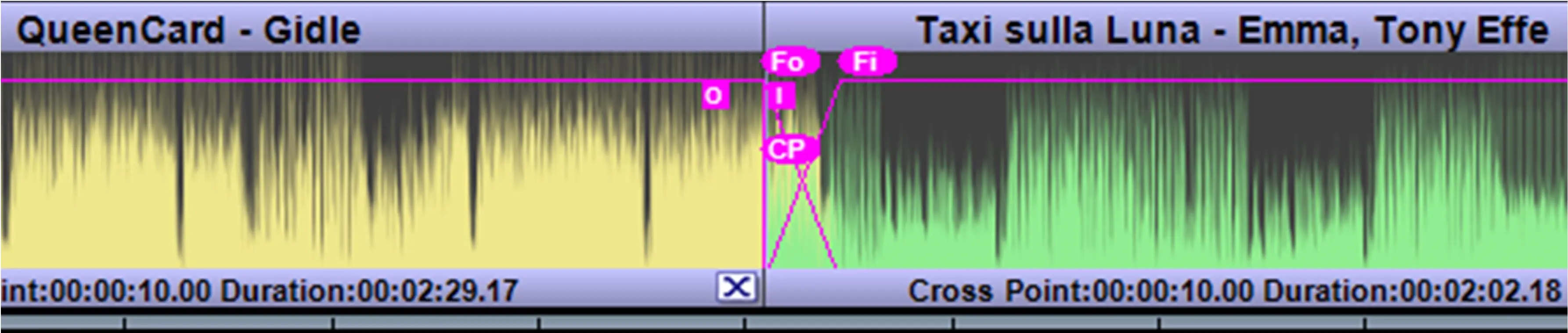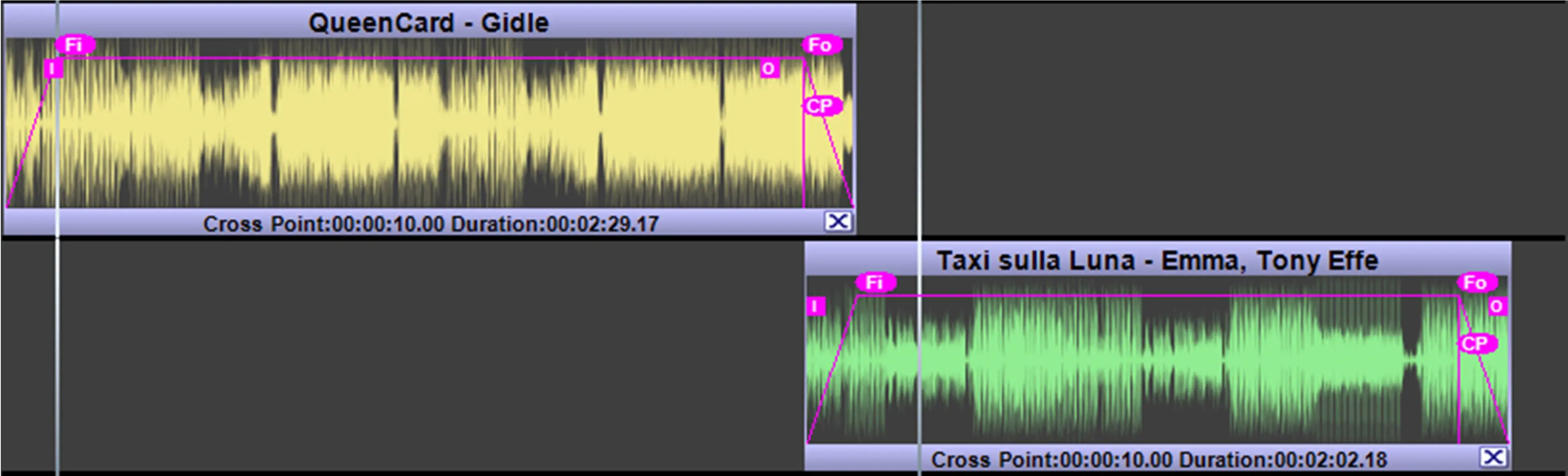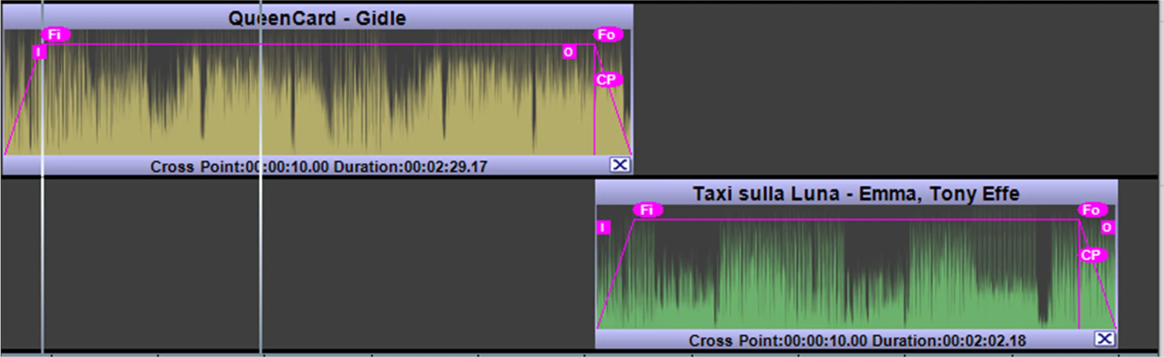 Cross Point (CP icon): This label lets you define the starting time where the two clips start overlapping, the setting is applied to the selected clip against the previous clip (so it is valid for clips starting from the second).