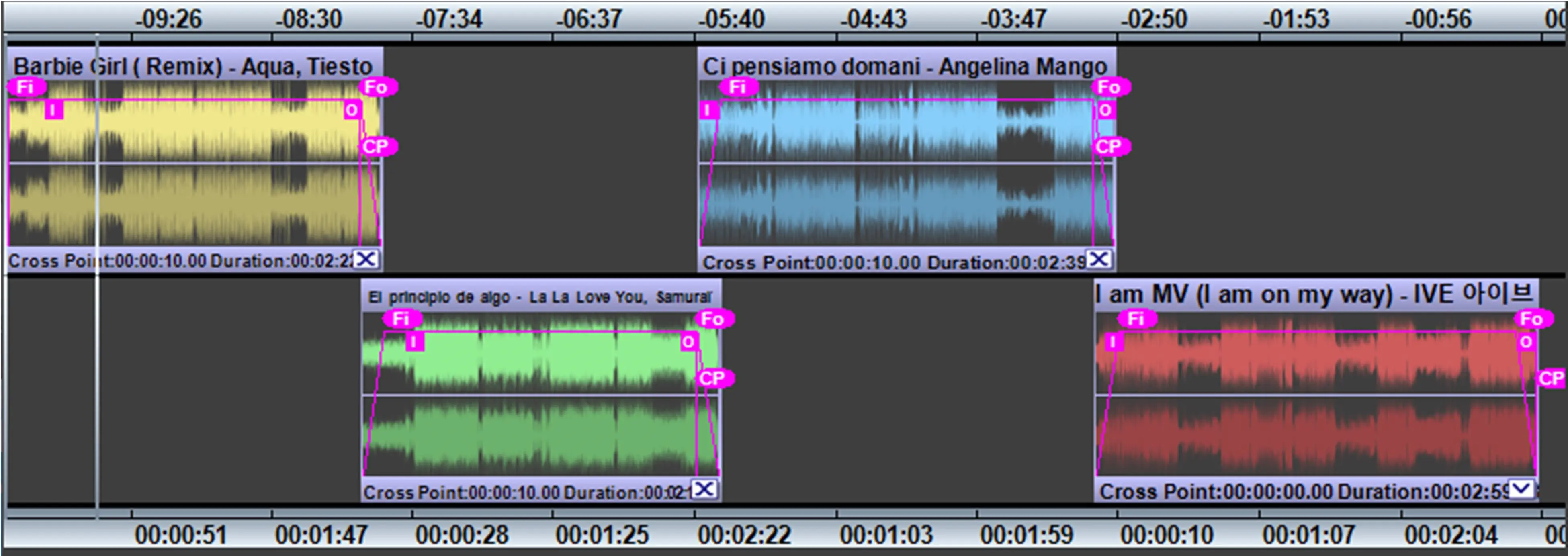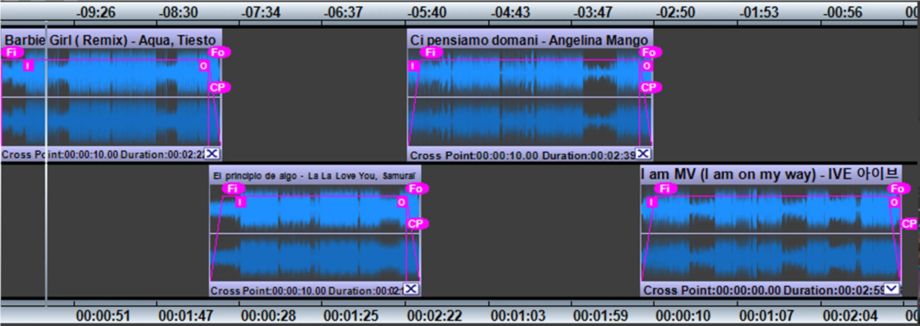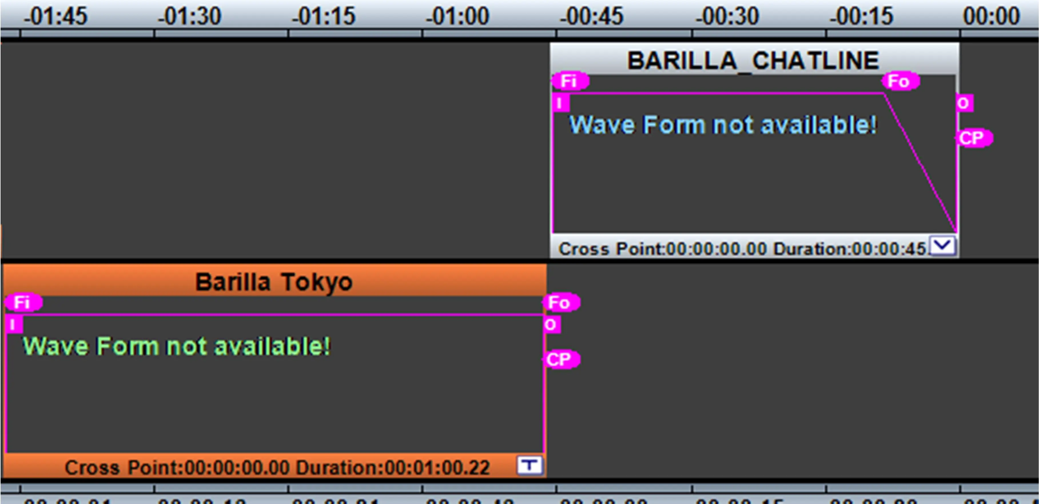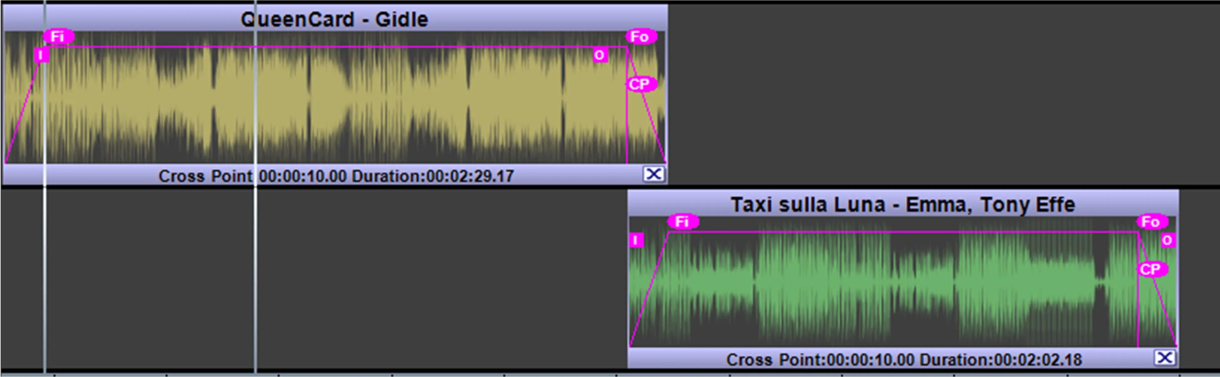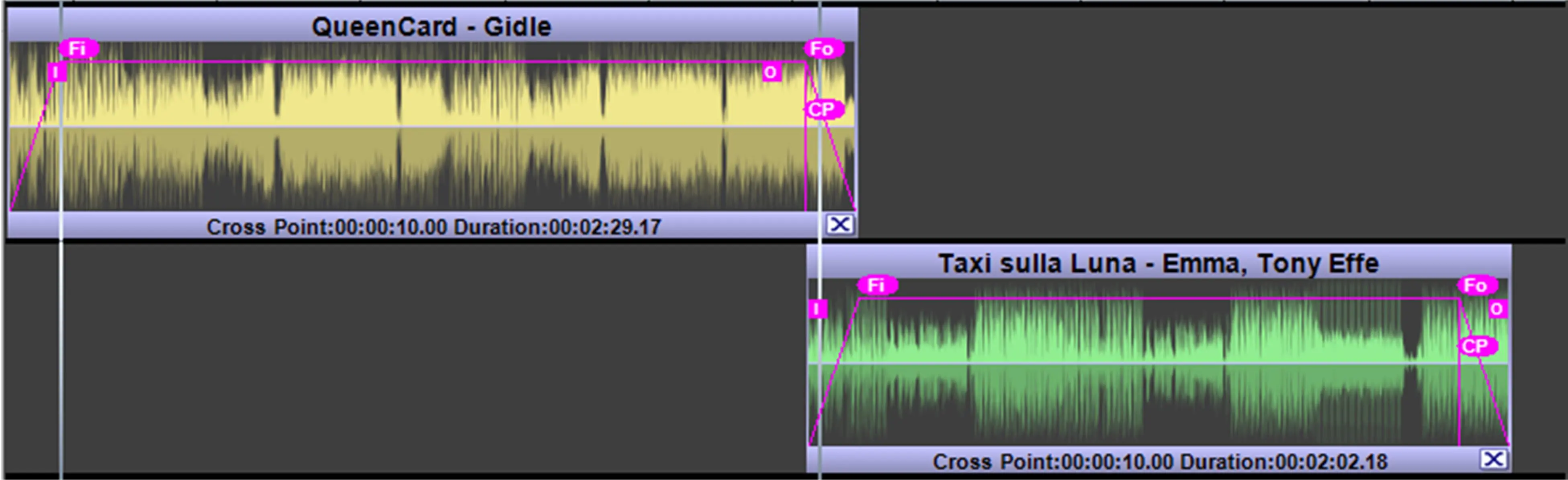 Cross Point (CP icon): This label lets you define the starting time where the two clips start overlapping, the setting is applied to the selected clip against the previous clip (so it is valid for clips starting from the second).