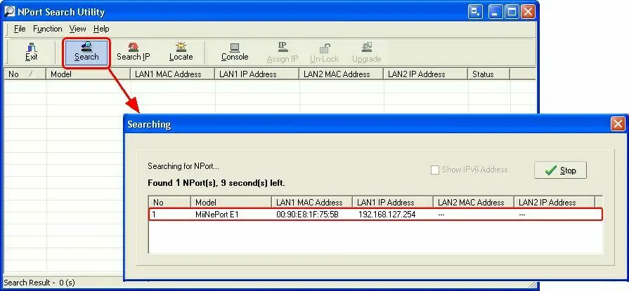 2. Start the NPort Search Utility program and press the [Search]¹ toolbar button to list all MiiNePort E1 modules connected to the same LAN as the computer: