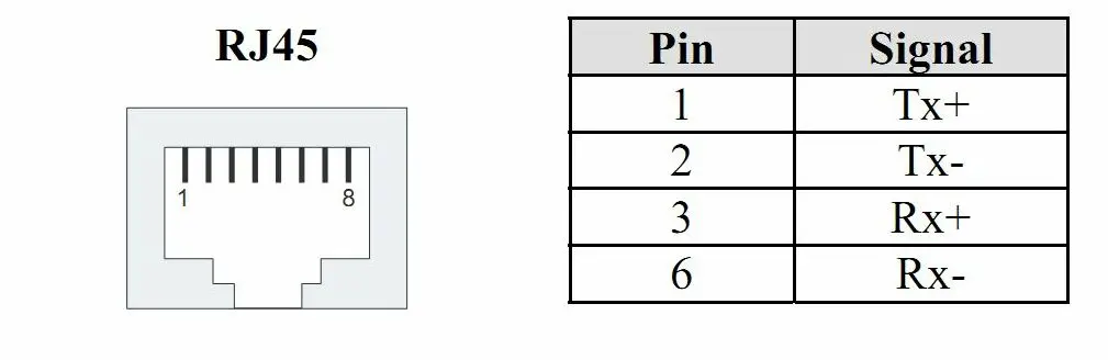 The ethernet port related to the RJ-45 connector including their assignments are illustrated below: