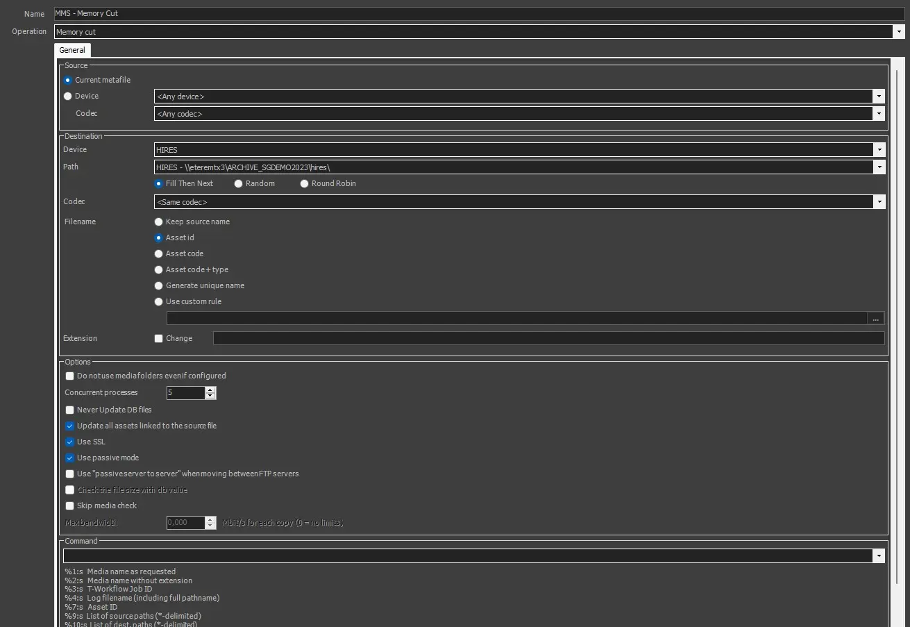Skip media check: Allow to avoid checking if the source file's device and codec match with the ones defined in the action. This is mandatory in the case of the Memory cut action because the Memory cut wf is attached to a new empty asset with no meta file, so the action would end in error if this parameter is disabled.