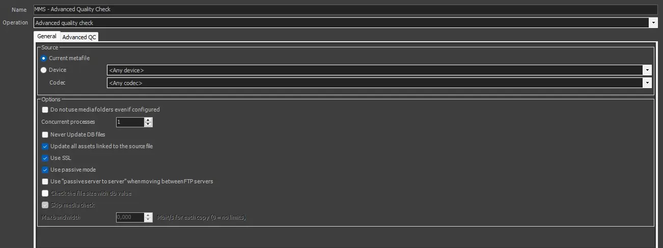Source Repository: The repository used by Advanced QC. The path must match one of Etere's Media folder entries. If left blank or auto, the Media Manager Service will search for a repository with the path written exactly as the media folder where the file to be analysed is. Otherwise, the repository will process the file specified in the configuration.
