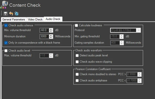 - Check audio wave clipping: If enabled, counts the number of times the audio waveform goes off the scale. The result value is stored in the CMS > AudioWaveClippingCount (0F.01.04.00.00.00.00.00) asset metadata.