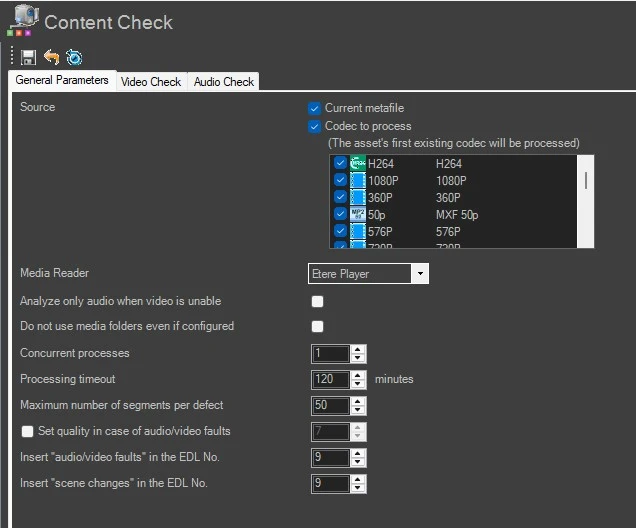 • Set quality in case of audio/video faults: Set the quality value (0-9) to be assigned to the asset in case defective segments are detected during the check. Changing the quality when audio/video defects are encountered is useful to determine whether an asset has successfully passed the content check.